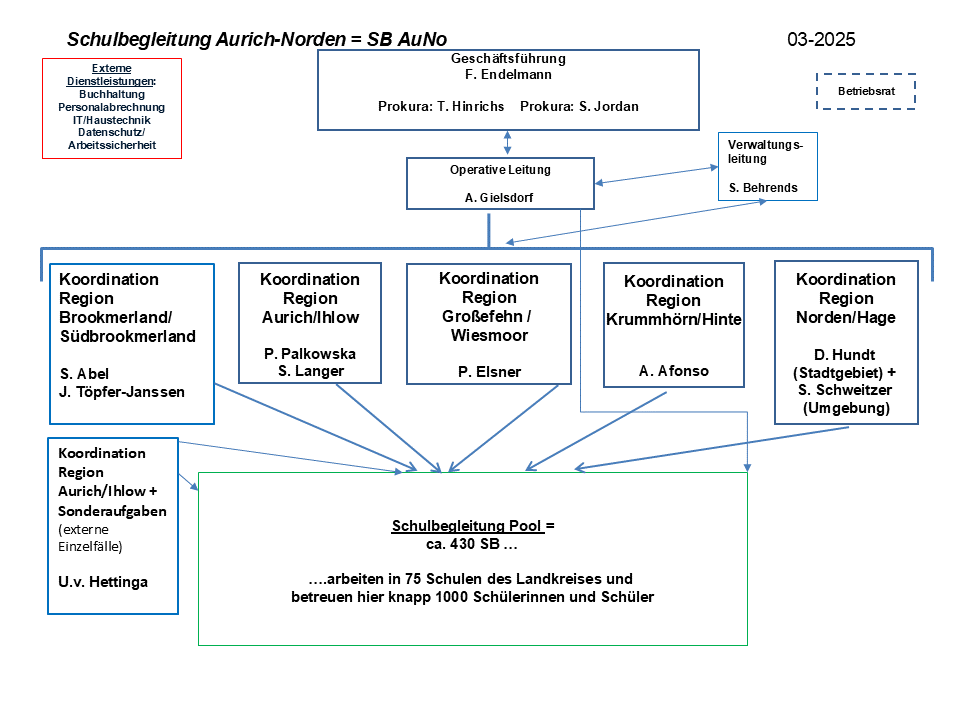 Seit August 2018 hat der gesamte Landkreis Aurich die Organisation der Schulbegleitung umstrukturiert. Über das Amt für Jugend und Soziales und ihrem Dienstleister der Schulbegleitung AuNo gGmbH (kurz „AuNo“) werden die Schulen (die sich in fünf Schulverbünden zusammengeschlossen haben) mit Schulbegleitenden ausgerüstet, die sofort für die bedürftigen Schülerinnen und Schüler aktiv werden können. Diese neue Organisation wurde in einem Modellversuch bis 2024 erprobt.